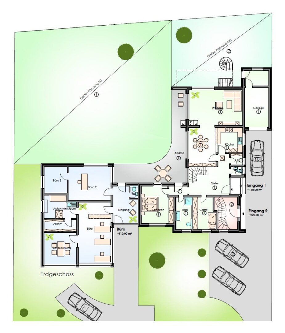 Im Erdgeschoss befindet sich zusätzlich eine Büroeinheit mit funktionalem Grundriss und angenehmer Belichtung. Die Gewerbeeinheit profitiert von einer großzügigen Fensterfront und einer guten Sichtbarkeit. Die Fläche eignet sich opti-mal für Dienstleister, Freiberufler oder kleine Unternehmen und bietet durch ihre gute Erreichbarkeit beste Voraussetzungen für einen erfolgreichen Geschäftsbetrieb. Gleichzeitig kann diese Einheit auch für familiennahe Nutzungen interessant sein – etwa als Praxis, Atelier, Homeoffice-Bereich oder für ein familiengeführtes Unternehmen.