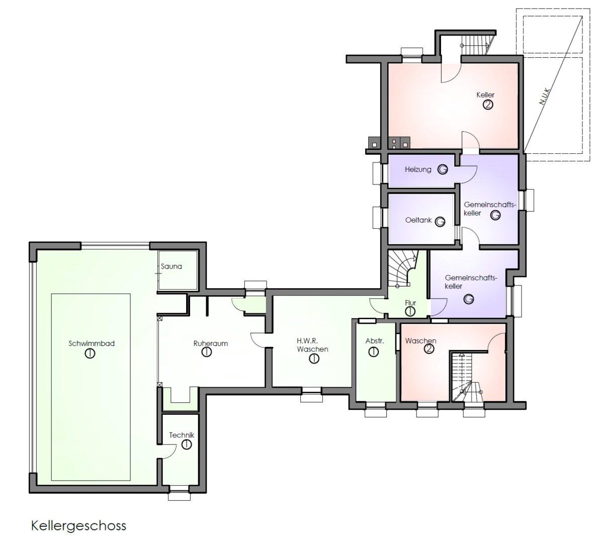 Ein besonderes Merkmal der Immobilie ist der Vollkeller mit einem großzügigen, derzeit nicht mehr genutzten Schwimmhallen- bzw. Wellnessbereich inklusive Sauna. Diese Fläche bietet interessante Perspektiven für eine Reaktivierung als private Wellnessoase oder alternative Nutzungsmöglichkeiten, beispielsweise als Fitness-, Hobby- oder Lagerfläche. Auch im Kontext eines Mehrgenerationenhauses könnte dieser Bereich zu einem gemeinschaftlichen Frei-zeit- oder Begegnungsraum umgestaltet werden.